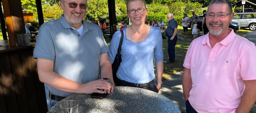 Die Bezirksverordneten Bernhard Lücke, René Rögner-Francke und Karen Wirrwitz führten beim Sommerfest der Kleingartenkolonie "Bahn-Landwirtschaft Bezirk Berlin e.V." gute Gespräche mit dem Vereinsvorsitzenden und Pächter der Gastronomie.
